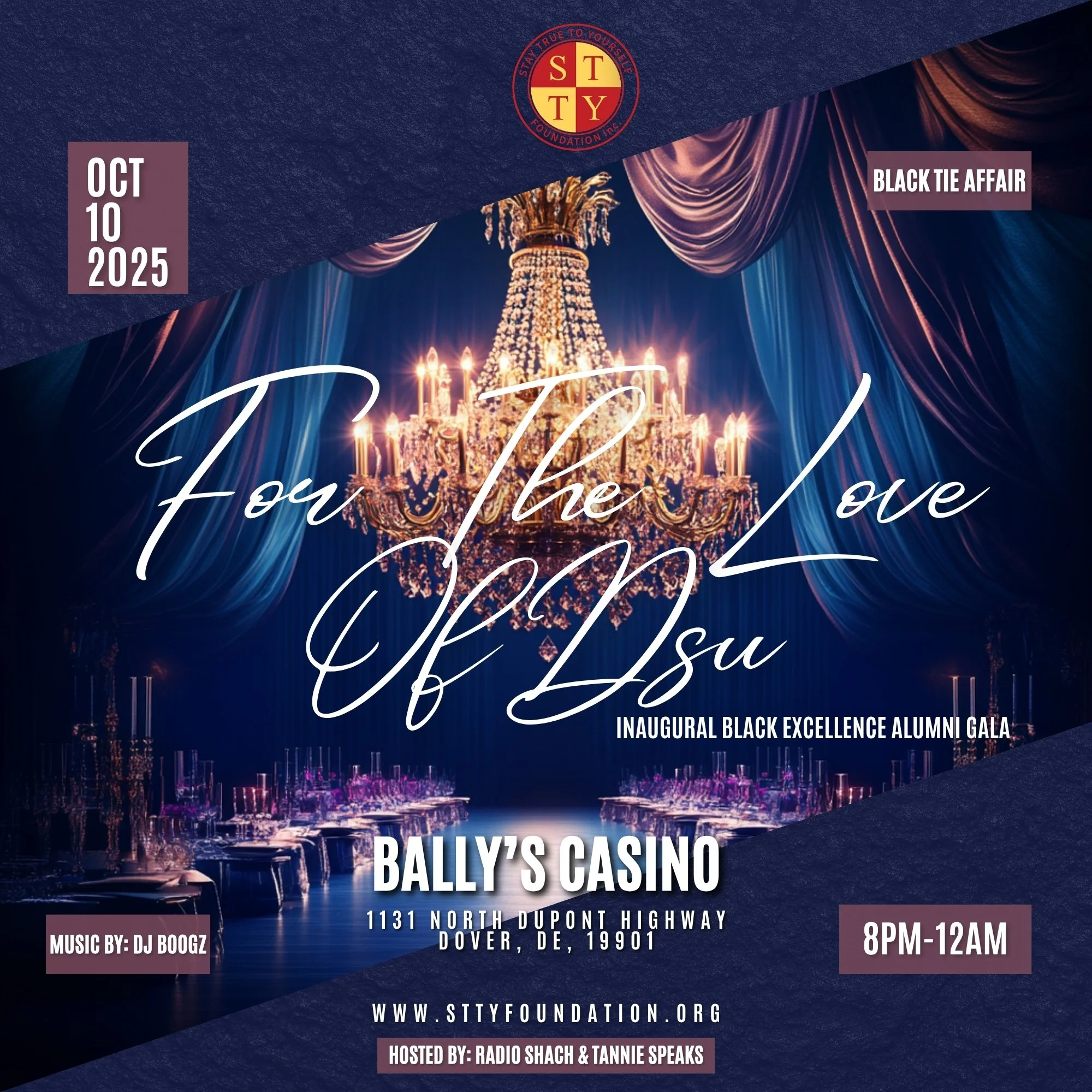 Welcome to the inaugural "For the Love of DSU" Black Excellence Alumni Gala! Join us for a night of black excellence as we come together to raise scholarship funds in honor our alma mater. The event will take place on Fri, Oct 10, 2025 at 8:00 PM at the beautiful Bally's Dover Casino Resort.